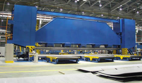![]() 船用三輥對稱式卷板機結構型式為三輥對稱式,上輥在兩下輥中央對稱位置作垂直升降運動,通過液壓缸內的液壓油作用于活塞桿而獲得,為液壓傳動;通過特殊設計減速機分別帶動全滾動軸承的兩下輥作旋轉運動,為卷制板材提供扭矩;在下輥下部設有多組托輥,以提高下輥的剛度,并可進行垂直調節;在上輥的上部設有剛性大梁,在大梁與上輥之間設有多組托輥,以提高上輥的剛度;適用于超寬圓弧形零件的卷制。